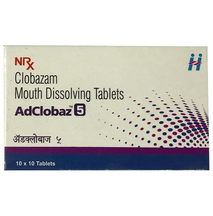 Adclobaz 5 Tablet MD belongs to a class of medicines known as benzodiazepines. It is used to treat epilepsy (seizures) and severe anxiety. It works by suppressing the abnormal and excessive activity of the nerve cells in the brain. Adclobaz 5 Tablet MD may be taken with or without food. However, it is advised to take it at the same time each day as this helps to maintain a consistent level of medicine in the body. Take this medicine in the dose and duration as advised by your doctor as it has a high potential of habit-forming. If you have missed a dose, take it as soon as you remember and finish the full course of treatment even if you feel better. It is important that this medication is not stopped suddenly without talking to your doctor as it may increase seizure frequency. Some common side effects of this medicine include tiredness, slurred speech, fever, cough, drooling, constipation, and difficulty in passing urine. It may cause dizziness and sleepiness, so do not drive or do anything that requires mental focus until you know how this medicine affects you. It is important to consult the doctor if you notice blisters on the skin or inside your mouth. If you have been taking this medicine for a long time then regular monitoring of blood and liver functions may be required.