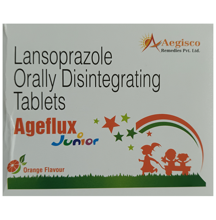 Ageflux Junior Orally Disintegrating Tablet is a medicine that reduces the amount of acid produced in your stomach. It is used for treating acid-related diseases of the stomach and intestine such as acid reflux, peptic ulcer disease, and some other stomach conditions associated with excessive acid production. Ageflux Junior Orally Disintegrating Tablet is also used to prevent stomach ulcers and acidity that may be seen with the prolonged use of painkillers. It belongs to a class of medicines known as proton pump inhibitors (PPIs). This medicine should be taken one hour before a meal, preferably in the morning. The dose will depend on your underlying condition and how you respond to the medicine. You should keep on taking it as prescribed even if your symptoms disappear quickly. You can increase the efficiency of the treatment by eating smaller meals more often and avoiding caffeinated drinks (like tea and coffee), and spicy or fatty foods. The most common side effects observed with this medicine include nausea, headache, flatulence, and diarrhea. These symptoms are generally mild but if they bother you or do not go away, consult your doctor. Long-term use of this medicine may lead to an increased risk of side effects. For instance, using this medicine for more than 1 year may increase your risk for bone fractures, especially with higher doses. Talk to your doctor about ways to prevent bone loss (osteoporosis), like taking calcium and vitamin D supplements. Before taking this medicine, you need to tell your doctor if you have severe liver problems, are taking medicines for HIV, have ever had an allergic reaction to similar medicines in the past, or suffer from bone loss (osteoporosis). Pregnant or breastfeeding women should also consult their doctor before taking it.