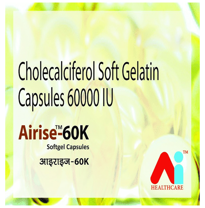 Airise 60k Softgel Capsule is used in the treatment of vitamin D deficiency and osteoporosis. It helps the body to absorb calcium. Calcium is essential for maintaining strong and healthy bones. it is used when your diet does not provide enough. Airise 60k Softgel Capsule should be taken as directed by your doctor. It is best taken with or after food as this helps your body absorb it and you should take it regularly to get the most benefit. If you are using it to treat osteoporosis you will be prescribed other medicines as well. This medicine may be only part of a complete program of treatment that also includes making changes to your diet and taking calcium and vitamin supplements. Learn about the foods you should eat to make sure you get enough calcium and vitamin D in your diet. Airise 60k Softgel Capsule has few side effects and none are common. If you take too much you may feel weakness, muscle pain, or have a metallic taste in your mouth. If experience any such side effects, speak with your doctor. They may be able to help you reduce or treat the symptoms. Before taking this medicine, tell your doctor if you have high levels of calcium in your blood or if you have any heart, kidney, or liver disease. Some other medicines can decrease the absorption of vitamin D3 so let your doctor know all other medicines you are taking to make sure you are safe. This medicine may help during pregnancy when your body needs more vitamin D but too much could harm your baby. Discuss with your doctor.