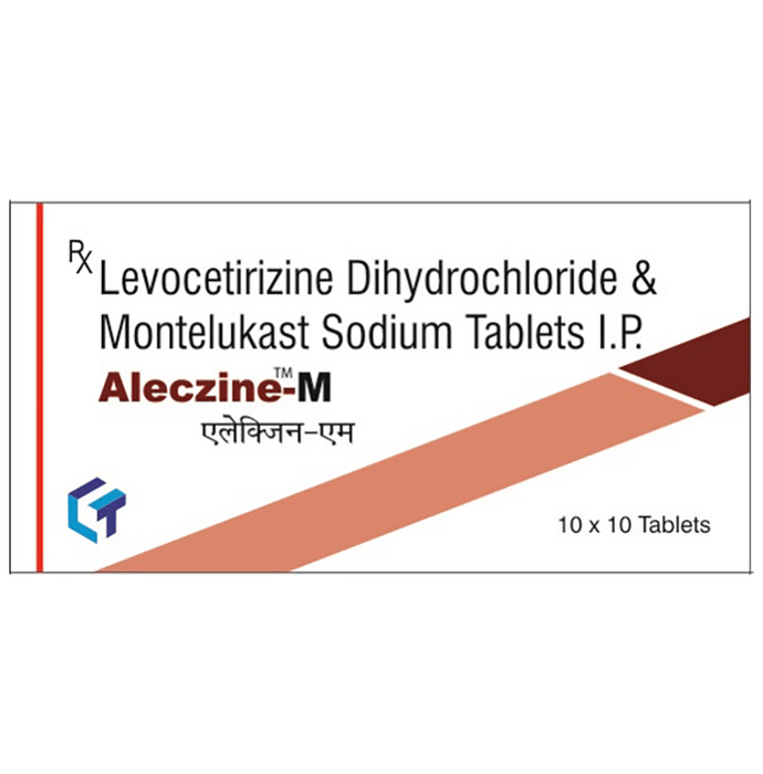Aleczine-M Tablet is a combination medicine used in the treatment of allergic symptoms such as runny nose, stuffy nose, sneezing, itching, swelling, watery eyes and congestion or stuffiness. It also reduces inflammation in the airways and make breathing easier. Aleczine-M Tablet is taken with or without food in a dose and duration as advised by the doctor. The dose you are given will depend on your condition and how you respond to the medicine. You should keep taking this medicine for as long as your doctor recommends. If you stop treatment too early your symptoms may come back and your condition may worsen. Let your healthcare team know about all other medications you are taking as some may affect, or be affected by this medicine. The most common side effects are nausea, diarrhea, vomiting, dryness in the mouth, headache, skin rash, flu-like symptoms, and fatigue. Most of these are temporary and usually resolve with time. Contact your doctor straight away if you are at all concerned about any of these side effects. This medicine may cause dizziness and sleepiness, so do not drive or do anything that requires mental focus until you know how this medicine affects you. Avoid drinking alcohol while taking this medicine as it can worsen your sleepiness. Never support self-medication or recommend your medicine to another person. It is beneficial to have plenty of fluids while taking this medication. Before you start taking this medicine it is important to inform your doctor if you are suffering from kidney disease.