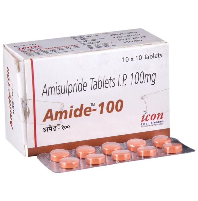 Amide 100 Tablet is a prescription medicine used in the treatment of schizophrenia, a mental disorder that can result in hallucinations or delusions and also adversely affects a person’s ability to think and behave. Amide 100 Tablet may be taken with or without food, preferably before bedtime. However, it is advised to take it at the same time each day as this helps to maintain a consistent level of medicine in the body. Take this medicine in the dose and duration as advised by your doctor and if you have missed a dose, take it as soon as you remember. Do not skip any doses and finish the full course of treatment even if you feel better. It is important that this medication is not stopped suddenly without talking to your doctor as it may worsen your symptoms. Some common side effects of this medicine include nausea, vomiting, and dryness in the mouth. Initially, this medicine may cause a sudden drop in blood pressure when you change positions, so it is better to rise slowly if you have been sitting or lying down. It also causes dizziness and sleepiness, so do not drive or do anything that requires mental focus until you know how this medicine affects you. This medicine can lead to weight gain and may increase your blood sugar and cholesterol levels. However, modifying your lifestyle by having a healthy diet and exercising regularly can reduce this side effect.