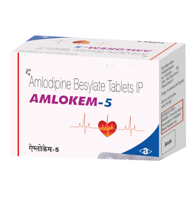 Amlokem 5mg Tablet belongs to a class of medicines known as calcium channel blockers. It is used to treat high blood pressure (hypertension) and prevent angina (heart-related chest pain). It lowers blood pressure and reduces the heart's workload, which helps prevent heart attacks and strokes. Amlokem 5mg Tablet may be prescribed alone or along with other medicines. The dose depends on what you are taking it for and the severity of your condition. You can take it at any time of the day, with or without food, but it is best to take it at about the same time each day. You should take this medicine for as long as it is prescribed for you. Even if you feel well, do not stop this medicine on your own because high blood pressure often has no symptoms. If you stop taking it, your condition may get worse. Keeping yourself active with regular exercise, managing your weight, and eating a healthy diet will also help control your blood pressure. The most common side effects include headache, fatigue, nausea, abdominal pain, and sleepiness. Consult your doctor if any of these side effects bother you or do not go away. They may be able to suggest ways to prevent or reduce the side effects. Before taking it, let your doctor know if you have any liver, heart, or kidney problems. Pregnant or breastfeeding women should also consult their doctor before taking this medicine. You also need to tell your doctor about all the other medicines you are taking, especially those used to treat high blood pressure or heart conditions. You should have your blood pressure checked regularly to make sure that this medicine is working properly.