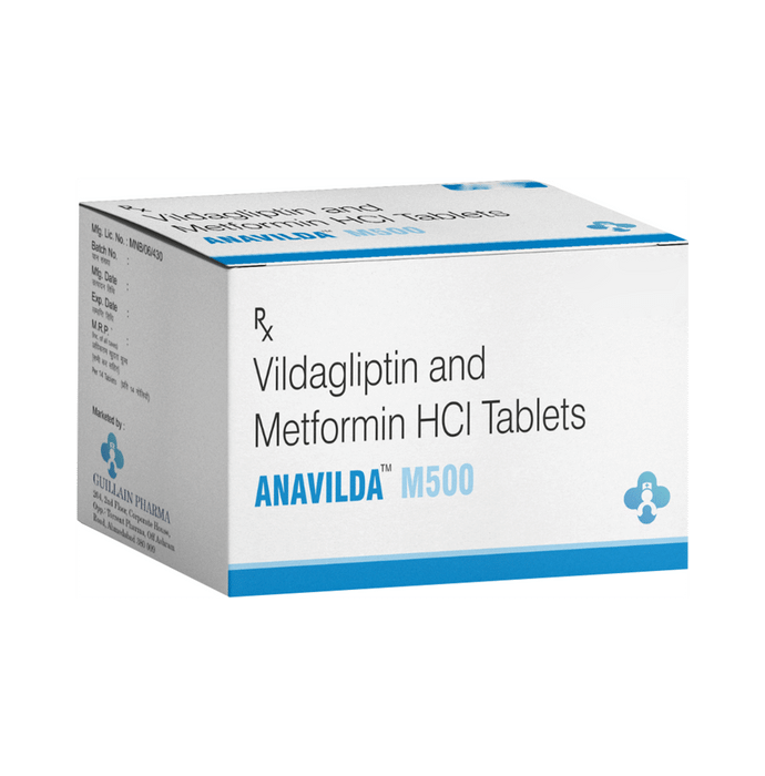 Anavilda M500 Tablet is a combination of two medicines that control high blood sugar levels in people with type 2 diabetes mellitus. This helps prevent serious complications of diabetes such as kidney damage and blindness and may also reduce your chances of having a heart attack or stroke. Anavilda M500 Tablet can be prescribed alone or together with other diabetes medications. All diabetes medicines work best when used along with a healthy diet and regular exercise. The dose you are given will depend on your condition, blood sugar levels, and what other medicines you are taking. Taking it with meals helps to reduce the chances of developing an upset stomach. You should take it regularly, at the same time each day, to get the most benefit and you should not stop unless your doctor recommends it. It is controlling your blood sugar levels and helping to prevent serious complications in the future. It is important to stay on the diet and exercise program recommended by your doctor while taking this medicine. Your lifestyle plays a big part in controlling diabetes. The most common side effects of taking this medicine include diarrhea, nausea, vomiting, upset stomach, headache, and sore throat. Low blood sugar level (hypoglycemia) is a possible side effect if you are also taking other diabetes medicines like insulin or sulphonylurea, so you need to know how to recognize and deal with it. This medicine is not suitable for everyone. Before taking it, you should let your doctor know if you have ever had kidney, liver, or heart disease, problems with your pancreas, or if you drink a lot of alcohol. Pregnant or breastfeeding women should also consult their doctor before taking this medicine. Some other medicines can affect this one so tell your doctor about all the medicines you are taking to make sure you are safe. You should try to avoid drinking alcohol as it lowers blood glucose. Your doctor will check your kidney function and blood sugar levels before and during treatment.