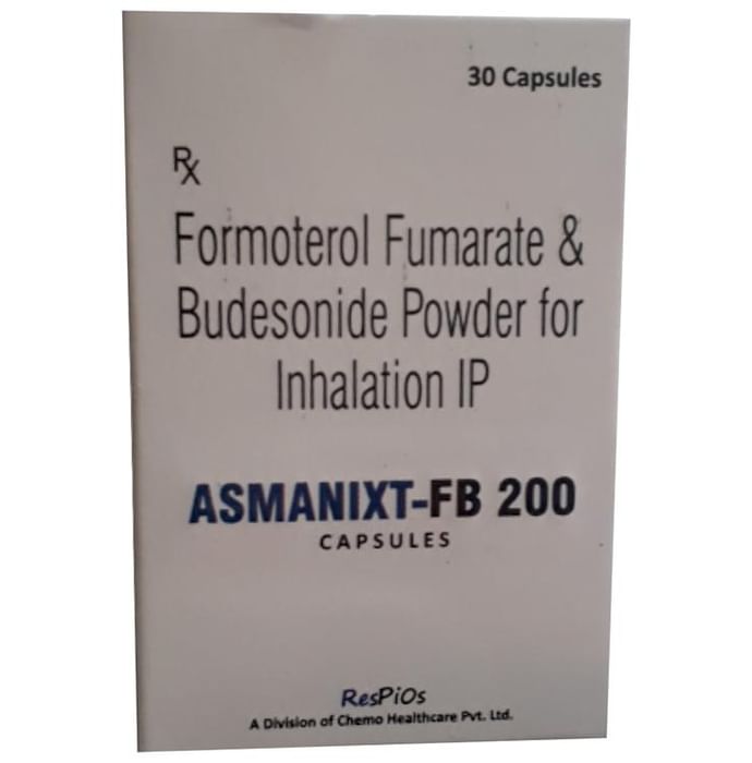 Asmanixt-FB 200 Capsule is a combination of two medicines in one inhaler. It relieves the long-term symptoms of asthma and COPD, making breathing easier. It works by inhibiting the release of certain chemical messengers that cause inflammation (swelling) and relaxes the muscles in the airways. Your doctor will tell you how often you need to use your inhaler. The effect of this medicine may be noticeable after a few days but will only reach its maximum after a few weeks. This medicine must be used regularly to be effective, so go on taking it even if you don't have any symptoms. That means it’s doing its job. If you stop taking it your symptoms may get worse. This medicine should not be used to relieve sudden shortness of breath. If sudden shortness of breath occurs, use your rescue inhaler. To get the benefit from this medicine you need to make sure you get your inhaler technique right, otherwise, it does not work as well. The most common side effects are nausea, vomiting, respiratory tract infection, hoarseness of voice, fungal infections in the mouth, cough, headache, sore throat, musculoskeletal (bone, muscle or joint) pain, and increased heart rate. If you get there, don’t stop taking it but do talk to your doctor. You can prevent some of these symptoms by rinsing your mouth and throat with water or brushing your teeth after using your inhaler. There are other, rarer side effects which can be serious. Talk to your doctor if you're worried about them. Before taking it, you should tell your doctor if you have any kidney or liver diseases so that your doctor can prescribe a suitable dose for you. You should also tell your doctor if you are pregnant, planning pregnancy or breastfeeding.