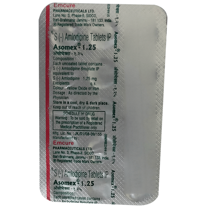 Asomex 1.25mg Tablet belongs to a class of medicines known as calcium channel blockers. It is used to treat high blood pressure (hypertension) and prevent angina (heart-related chest pain). It lowers blood pressure and reduces the heart's workload, which helps prevent heart attacks and strokes. Asomex 1.25mg Tablet may be prescribed alone or along with other medicines. The dose depends on what you are taking it for and the severity of your condition. You can take it at any time of the day, with or without food, but it is best to take it at about the same time each day. You should take this medicine for as long as it is prescribed for you. Even if you feel well, do not stop this medicine on your own because high blood pressure often has no symptoms. If you stop taking it, your condition may get worse. Keeping yourself active with regular exercise, managing your weight, and eating a healthy diet will also help control your blood pressure. The most common side effects include headache, fatigue, nausea, abdominal pain, and sleepiness. Consult your doctor if any of these side effects bother you or do not go away. They may be able to suggest ways to prevent or reduce the side effects. Before taking it, let your doctor know if you have any liver, heart, or kidney problems. Pregnant or breastfeeding women should also consult their doctor before taking this medicine. You also need to tell your doctor about all the other medicines you are taking, especially those used to treat high blood pressure or heart conditions. You should have your blood pressure checked regularly to make sure that this medicine is working properly.