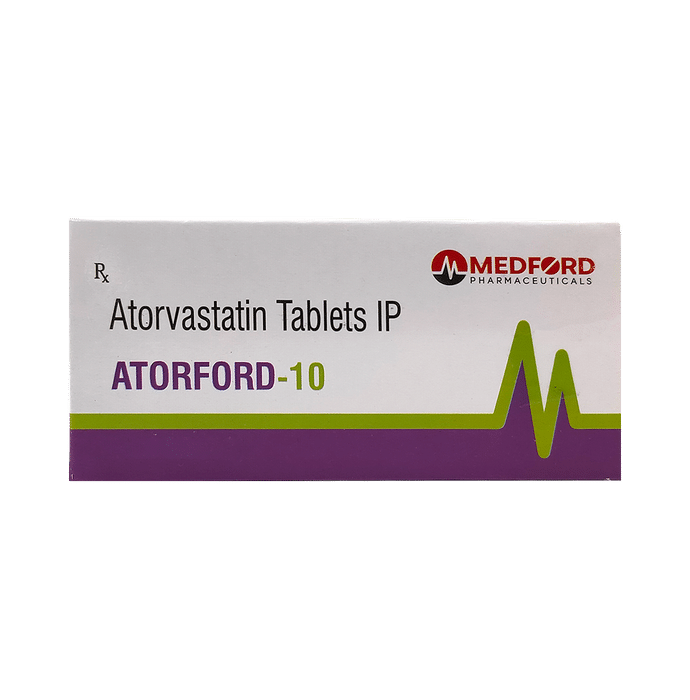 Atorford 10 Tablet belongs to a group of medicines called statins. It is used to lower cholesterol and to reduce the risk of heart diseases. Cholesterol is a fatty substance that builds up in your blood vessels and causes narrowing, which may lead to a heart attack or stroke. Atorford 10 Tablet is a widely prescribed medicine and is regarded as safe for long-term use when taken as per the doctor's advice. It can be taken with a meal or on an empty stomach. You can take it at any time of the day but try to take it at about the same time each day. Most people with high cholesterol do not feel ill, but stopping your medicine may increase your cholesterol levels thereby increasing your risk of heart disease and stroke. It is important to have your cholesterol levels checked regularly. This medicine is only one part of the treatment program which should also include a healthy diet, regular exercise, smoking cessation, moderation of alcohol intake, and weight reduction. You can eat normally while taking this medicine, but try to avoid foods that are high in fat. Common side effects of this medicine include constipation, flatulence, dyspepsia, and abdominal pain. These are usually mild and disappear after a short time. Consult your doctor if they persist or if you notice any yellowing of your eyes or get repeated or unexplained muscle pains. This medicine should not be used in some conditions such as liver disease. Also, pregnant women and breastfeeding mothers should not take this medicine as it may harm the developing baby. Diabetic patients should monitor their blood sugar levels while taking this medicine, as it may lead to an increase in blood sugar levels. Your doctor may check your liver function before starting the treatment and monitor it regularly thereafter.