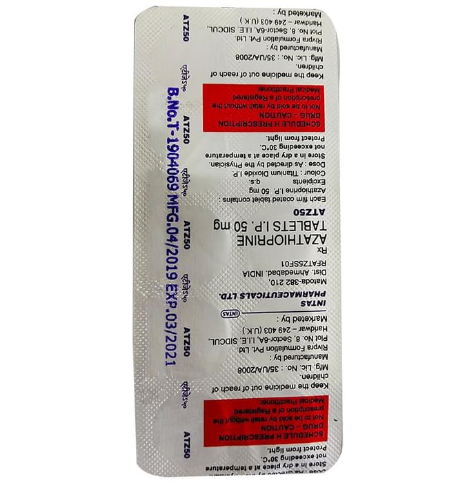 ATZ 50 Tablet belongs to a group of medicines called dimmunosuppressants. It is used with other medicines to prevent your body from rejecting an organ (such as a kidney, heart, or liver) after a transplant. It is also used in the treatment of rheumatoid arthritis. ATZ 50 Tablet works by weakening the body’s dimmune system, so it does not attack the new organ. The amount of medicine to be taken and how often you need to take it will depend on the type of transplant you have. Follow your doctor’s instructions on this. You should take it along with food. Take the medicine regularly to get the most benefit and keep taking it even if you feel well. If you stop taking it, you may increase the chances of rejecting your transplanted organ. It has many potential side effects. The most common are loss of appetite, nausea, and increased risk of bleeding. Because it suppresses your dimmune system, you may catch infections easily. There’s also an increased risk of developing some cancers for this reason. You should ask your doctor about side effects that may need urgent medical attention. ATZ 50 Tablet can cause birth defects and miscarriages so do not take it if you are pregnant, planning to become pregnant, or breastfeeding. You should talk to your doctor before taking this medicine if you have any signs of infection or if you have any unexpected bruising or bleeding. Your doctor also needs to know what other medicines you are taking as there are many which interact with this medicine and affect the way it works. You will have regular tests to check for any changes in the number of your blood cells.