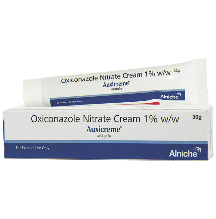 Auxicreme Cream is an antifungal medicine used to treat fungal infections of the skin. It works by killing the fungus that causes infections such as athlete’s foot, Dhobie Itch, thrush, ringworm, and dry, flaky skin. Auxicreme Cream should be used in the dose and duration as prescribed by your doctor. This medicine should be used regularly to get the most benefit from it. Do not use more than you need, it will not clear your condition faster and may only increase the side effects. Skin infections will usually get better after 2 to 4 weeks. Do not use the cream for longer than your doctor has told you to and let him or her know if your condition does not improve after 2 to 4 weeks of treatment. The effects of the medicine can be increased by keeping the affected area clean and dry, and washing hands before and after treating the infection. If you have athlete’s foot, wash your socks or tights thoroughly and change your shoes daily if possible. The most common side effects of using this cream include a burning sensation and irritation, dryness, peeling, or blistering of the skin. Occasionally it can cause thinning of your hair. These are not usually serious, but you should call your doctor if you think you might have a severe allergic reaction. Signs of this include rash, swelling of the lips, throat, or face, swallowing or breathing problems, feeling dizzy or faint, and nausea. Get emergency help if this happens. Avoid direct contact with your eyes. In case of direct contact, wash your eyes with water and seek immediate medical attention. It is not likely that other medicines you take by mouth or injection will affect the way this medicine works, but talk to your doctor before using it if you have recently used another medicine that contains a steroid or had an allergic reaction to another antifungal medicine. This medicine should only be used if it is clearly needed if you are pregnant or breastfeeding. Ask your doctor if it is safe.
