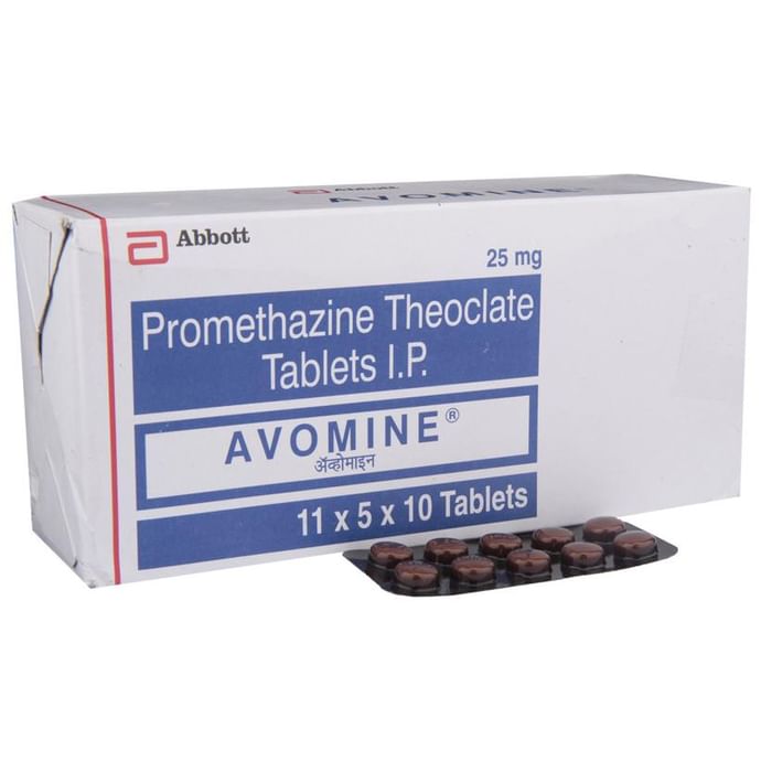 Avomine Tablet used in the treatment of nausea and vomiting related to certain conditions like before/after surgery or motion sickness. It may also be used to treat allergic conditions such as rash, itching, and runny nose. Avomine Tablet should be taken with or without food, but take it at the same tdime every day to get the most benefit. The dose and how often you take it depend on what you are taking it for. Your doctor will decide how much you need to dimprove your symptoms. You should take this medicine for as long as it is prescribed for you. If you miss a dose, take it as soon as you remember it. However, you should never take a double dose. Inform your doctor if your symptoms do not dimprove within 7 days of treatment. The most common side effects of this medicine include dry mouth, blur vision, headache, and feeling dizzy. If these bother you or appear serious, let your doctor know. There may be ways of reducing or preventing them. It makes skin more sensitive to sunlight. Use a sunscreen or wear protective clothing before going out. Before taking this medicine, let your doctor know if you have glaucoma or have asthma issues, or have high blood pressure. Inform your doctor if you are pregnant, or breastfeeding. Your doctor should also know about all other medicines you are taking as many of these may make this medicine less effective or change the way it works. Generally, it is advised to avoid alcohol while on treatment.