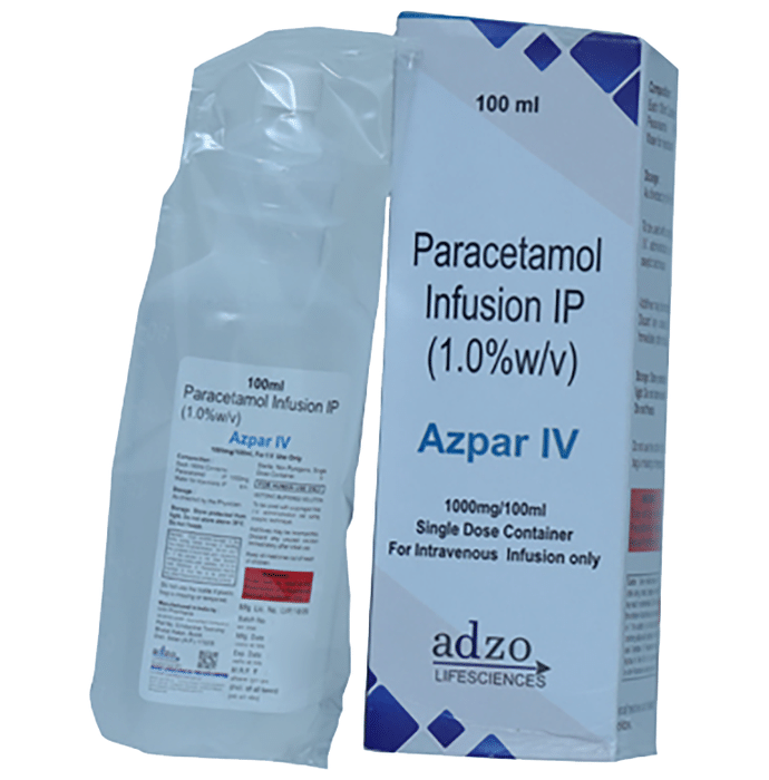 Azpar IV Infusion helps in relieving moderate pain and reducing fever. It effectively alleviates pain and reduces fever for the short-term in cases following surgery or in cases where oral administration is not possible. Azpar IV Infusion is administered by a doctor or a nurse and should not be self-administered. Depending on the severity of your underlying illness, your doctor will decide the precise dose and schedule as per which this injection is to be given. It starts working within one hour. Inform your doctor if you are also taking other medications containing paracetamol to avoid an overdose. You should let your doctor know if your pain or fever does not subside. Vomiting, difficulty sleeping, and constipation may be seen as side effects in some patients. Consult your doctor if these side effects do not resolve with time and persist for a longer duration of time. Inform your doctor immediately if any rash or allergic reaction is observed while taking this medicine. Pregnant and nursing women should use it under medical supervision only. It should be used with caution in patients with liver and kidney disease or alcohol abuse. It is not recommended in patients with severe or active liver disease.