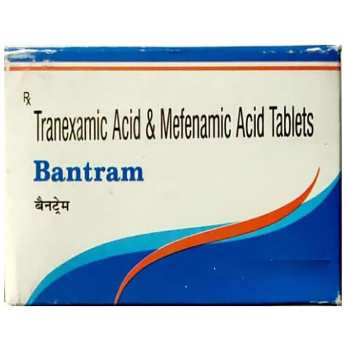 Bantram Tablet is a combination medicine used to treat heavy menstrual bleeding and menstrual pain. It prevents the breakdown of blood clots to control excessive bleeding during periods. It also blocks the production of certain chemical messengers that cause pain and inflammation. You can take Bantram Tablet at any time of day, with food, but it is best to take it at the same time each day. It should be taken on first day of the periods to get the most benefit. Keep taking it for as long as advised by your doctor. Take this medicine in the dose and duration advised by the doctor and if you have missed a dose, take it as soon as you remember. Remember to finish the full course of treatment even if you feel better. Inform your doctor if you do not observe any change in periods even after 3 consecutive periods. The most common side effects of this medicine include nausea, stomach pain, headache, nasal congestion, sinus pain, sinus inflammation, rash, tiredness, and musculoskeletal (bone, muscle or joint) pain. It may also cause diarrhea, so it is better to take plenty of fluids while taking this medicine as it may help to prevent dehydration. It is advised to consult with your doctor if you do not notice any changes in periods after 3 consecutive periods. Before taking it, let your doctor know if you have any kidney problems or vaginal bleeding disorder. Pregnant or breastfeeding women should also consult their doctor for advice before taking this medicine. You also need to tell your doctor what other medicines you are taking. You might be asked for eye check-ups while taking this medicine. It is advised to avoid alcohol while taking this medicine.