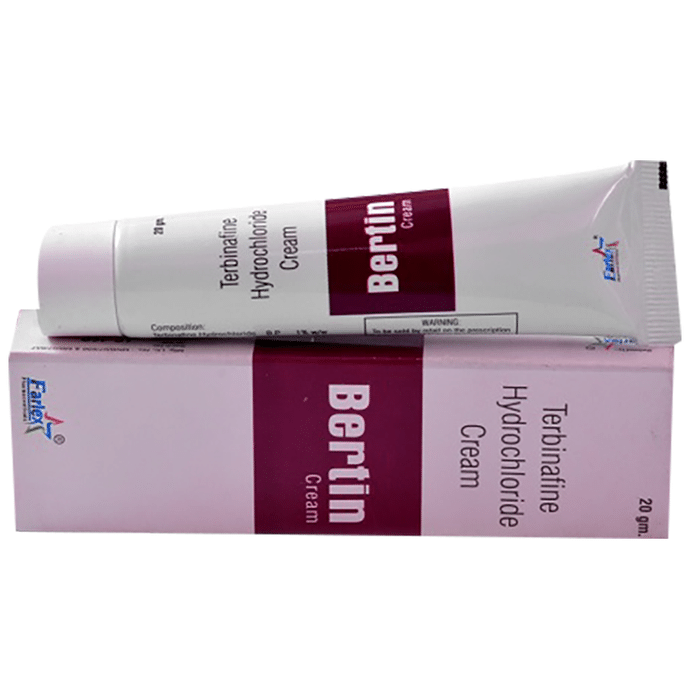 Bertin 1% Cream is used to treat a wide range of fungal infections of the skin and nails, including ringworm. It works by killing the fungi that cause the infection. Bertin 1% Cream is for external use only. It should be used in the dose and duration suggested by the doctor. The affected area should be clean and dry before the application of this medicine. You must wash your hands thoroughly before and after application. Do not stop using it until you have finished the complete course, even when you feel better. If you stop using this medicine too early, the fungi may continue to grow and the infection may return or worsen. The most common side effects of this medicine include application site reactions like burning, irritation, itching, and redness, and skin peeling. These are usually mild but let your doctor know if they bother you or last more than a few days. Avoid direct contact with the eyes, nose, or mouth. If accidental exposure occurs, rinse immediately with plenty of water. You must inform your doctor if there’s no improvement even after four weeks of treatment. It is not likely that other medicines you take by mouth or injection will affect the way this medicine works but inform your doctor about all other medicines you are taking. Also, let your doctor know if you have used a similar medicine before and had an allergic reaction. Pregnant and breastfeeding mothers should consult their doctor before using it.