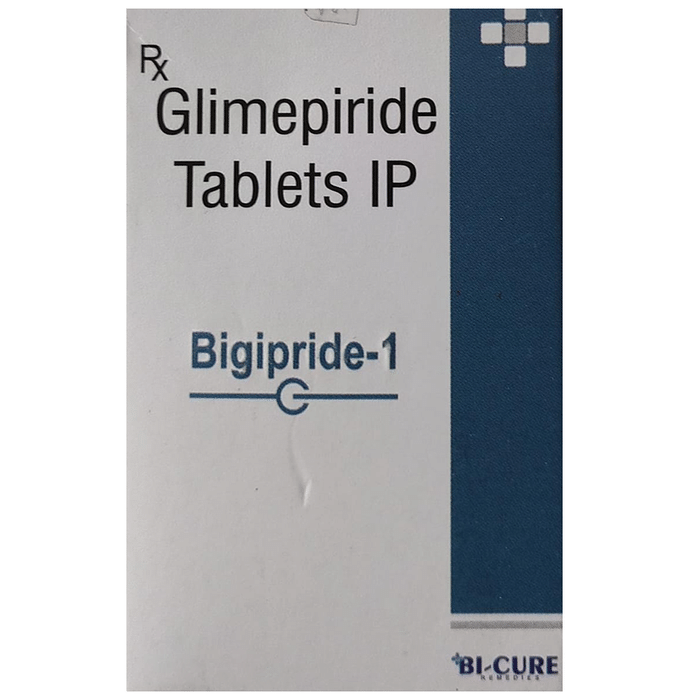 Bigipride 1 Tablet belongs to a group of medicines called sulfonylureas and is used to treat type 2 diabetes mellitus in adults. It helps control blood sugar levels in people with diabetes thereby preventing serious complications of diabetes such as kidney damage and blindness. Bigipride 1 Tablet may be used alone or along with other medicines. It should be taken just before or with the first meal of the day. Take it regularly at the same time each day to get the maximum benefit. Your doctor will decide what dose is best for you and this may change from time to time according to your blood sugar levels. Keep taking this medicine, even if you feel well or your blood sugar levels are controlled. If you stop it without consulting your doctor, your blood sugar levels could rise to put you at risk of diabetes complications such as kidney damage, blindness, nerve problems, and loss of limbs. Remember that it is only part of a treatment program that should also include a healthy diet, regular exercise, and weight reduction as advised by your doctor. Your lifestyle plays a big part in controlling diabetes. The most common side effects of taking this medicine include low blood sugar levels (hypoglycemia), nausea, headache, and dizziness. Make sure you recognize the signs of having low blood sugar levels, such as sweating, dizziness, headache, and shaking, and know how to deal with them. To prevent this, it is important to have regular meals and always carry a fast-acting source of glucose such as sugary food or fruit juice with you. Drinking alcohol can also increase your risk of low blood sugar levels and hence should be avoided. Some people may experience an increase in weight with this medicine. You should not take it if you have type 1 diabetes mellitus, diabetic ketoacidosis (high levels of acid in your blood), or if you have severe kidney or liver disease. Before taking this medicine, tell your doctor if you have ever had heart disease, thyroid disease, or some hormonal conditions, as it may not be suitable. Pregnant or breastfeeding women should also consult their doctor before taking it. Your blood sugar levels should be checked regularly and your doctor may also advise blood tests to monitor your blood cell counts and liver function.