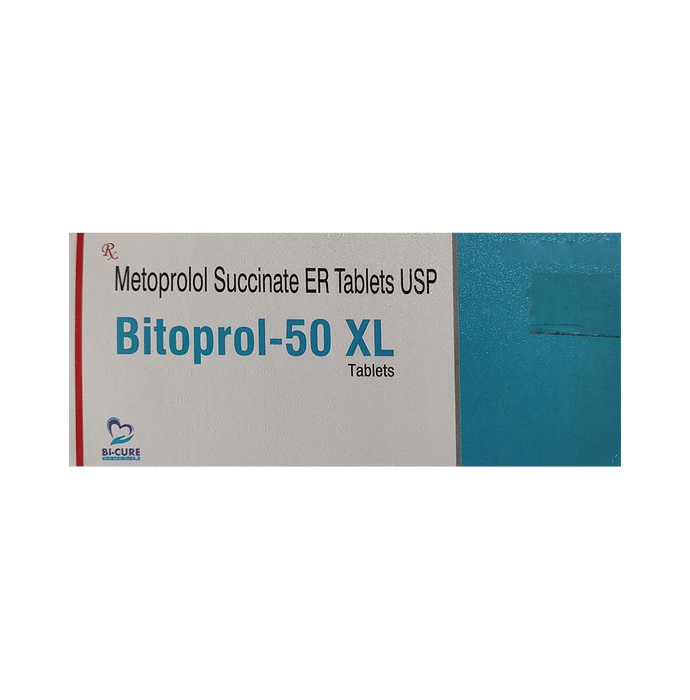 Bitoprol 50 XL Tablet belongs to a group of medicines called beta-blockers. It is used to treat high blood pressure (hypertension), angina (heart-related chest pain), and irregular heart rhythms (arrhythmia). It also helps to prevent migraines, future heart attacks, and stroke. Bitoprol 50 XL Tablet may be prescribed alone or together with other medications. The dose and frequency will depend on what you are taking it for and the severity of your condition. It may be taken empty stomach or with a meal, but take it regularly at the same time each day to get the maximum benefit. It may take several weeks before you get the full benefit of this medicine and you may need to take it for the rest of your life. However, it is important to continue taking it even if you feel well. Most people with high blood pressure do not have symptoms if you stop taking it your condition may worsen. The main side effects of Bitoprol 50 XL Tablet are fatigue, headache, slow heart rate, feeling dizzy, and nausea. These are usually mild and short-lived. It may also cause shortness of breath or low blood pressure in some people. To reduce the risk of side effects your doctor will probably start the medicine at a low dose and gradually increase it. Consult your doctor if the side effects bother you or do not go away. Before taking it, let your doctor know if you have any liver problems. It may also not be suitable for people who have a slow heart rate, severe circulation problems, severe heart failure, or low blood pressure. Pregnant or breastfeeding mothers should also consult their doctor before taking it. You must talk to your doctor to find out whether this medicine is suitable for you to use. You should have your blood pressure checked regularly to make sure that this medicine is working properly. Avoid drinking alcohol as it may increase certain side effects.