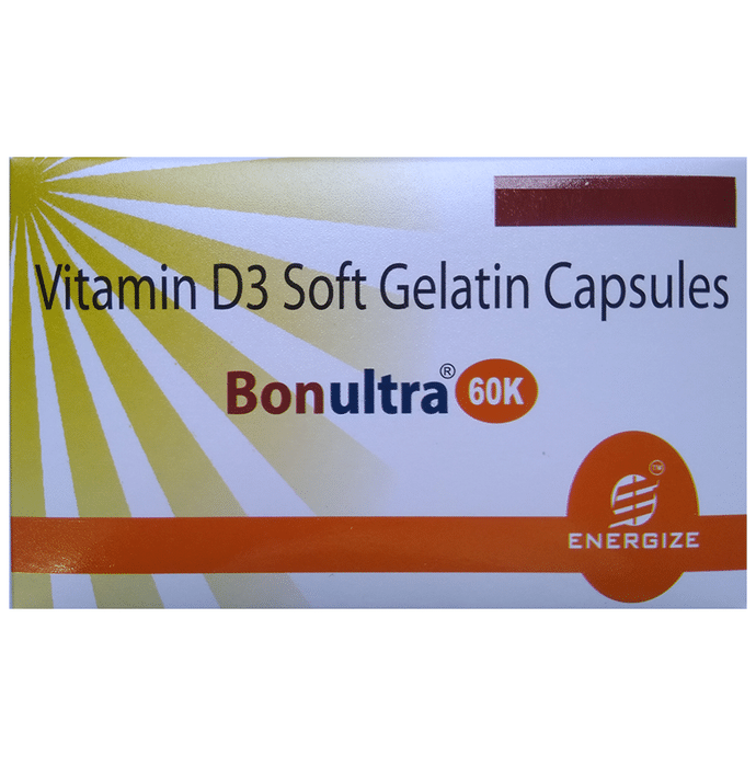 Bonultra 60K Soft Gelatin Capsule is used in the treatment of vitamin D deficiency and osteoporosis. It helps the body to absorb calcium. Calcium is essential for maintaining strong and healthy bones. it is used when your diet does not provide enough. Bonultra 60K Soft Gelatin Capsule should be taken as directed by your doctor. It is best taken with or after food as this helps your body absorb it and you should take it regularly to get the most benefit. If you are using it to treat osteoporosis you will be prescribed other medicines as well. This medicine may be only part of a complete program of treatment that also includes making changes to your diet and taking calcium and vitamin supplements. Learn about the foods you should eat to make sure you get enough calcium and vitamin D in your diet. Bonultra 60K Soft Gelatin Capsule has few side effects and none are common. If you take too much you may feel weakness, muscle pain, or have a metallic taste in your mouth. If experience any such side effects, speak with your doctor. They may be able to help you reduce or treat the symptoms. Before taking this medicine, tell your doctor if you have high levels of calcium in your blood or if you have any heart, kidney, or liver disease. Some other medicines can decrease the absorption of vitamin D3 so let your doctor know all other medicines you are taking to make sure you are safe. This medicine may help during pregnancy when your body needs more vitamin D but too much could harm your baby. Discuss with your doctor.
