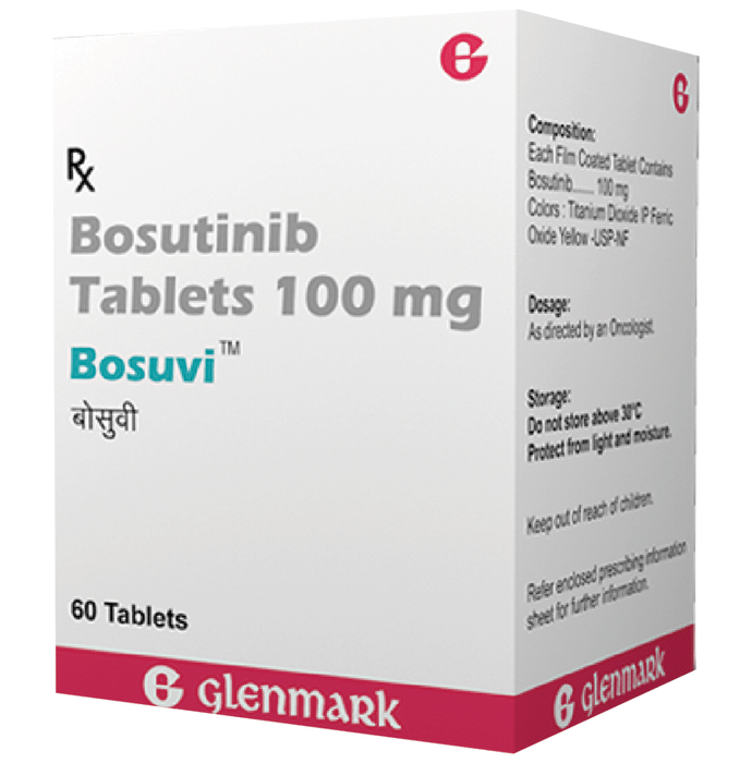 Bosuvi 100mg Tablet is an anti-cancer medicine. It is used in the treatment of certain blood cancer known as chronic myeloid leukemia. This medicine helps to slow down the growth and multiplication of cancer cells, thereby reducing the progress of the disease. Bosuvi 100mg Tablet should be taken as your doctor's advice. Your doctor will decide how much you need to take and for how long. You may take it with or without food. Take it regularly and take it at a fixed time each day to help you remember. You should not stop taking the medicine suddenly and continue taking it for as long as the doctor has prescribed. Common side effects of this medicine include respiratory tract infection, nasopharyngitis, low blood platelets, decreased white blood cell count, anemia, headache, breathlessness, cough, increased liver enzymes, diarrhea, vomiting, nausea, and abdominal pain. If any of these bothers you, let your doctor know. There may be ways of reducing or preventing them. You should also inform the doctor immediately if it causes severe headaches, swelling in one leg, pain on breathing, or changes in vision or hearing. Before taking Bosuvi 100mg Tablet, you should let your doctor know if you have any other preexisting medical conditions. You should also inform the doctor about all other medicines that you are taking. Pregnant and breastfeeding women should not take this medicine as it can cause harmful effects to the developing baby.