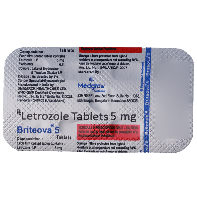 Briteova 5 Tablet helps treat breast cancer in post-menopausal women. It may be used alone or with other treatments, such as surgery or radiation. It can also be used in patients with advanced breast cancer to stop the tumor from spreading to other parts of the body. Briteova 5 Tablet is also helpful in the treatment of infertility. It can be taken with or without food, but take it at about the same time to get the most benefit. The dose and frequency depend on what you are taking it for. Your doctor will decide how much you need to improve your symptoms. You should take this medicine for as long as it is prescribed. This medicine's most common side effects include hot flashes, fatigue, increased sweating, and increased level of cholesterol (hypercholesterolemia). If these bother you or appear serious, let your doctor know. Your doctor may suggest ways to prevent or reduce these. Before taking this medicine, tell your doctor if you have ever had liver or kidney disease, or have a history of osteoporosis (thinning or wasting of bones). Your doctor should also know about all other medicines you are taking as many of these may make this medicine less effective or change the way it works. Tell your doctor if you are pregnant or breastfeeding. Your doctor may perform some blood tests to check for vitamin D level or bone density before and during treatment.