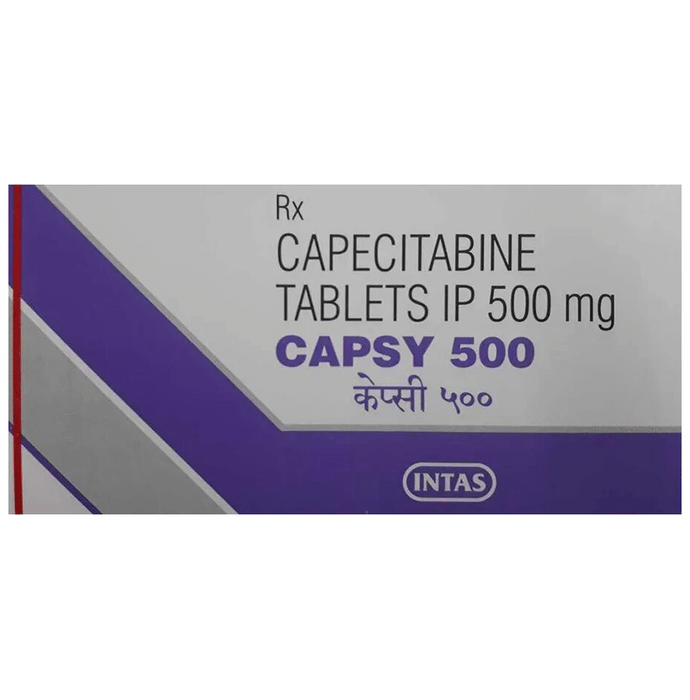 Capsy 500mg Tablet is used in the treatment of cancer of breast, colon, and rectum. It may be also used to treat other conditions, as determined by the doctor. It is used alone or in combination with some other medicine as a part of chemotherapy. Capsy 500mg Tablet should be taken with food within 30 minutes after eating a meal. Your doctor will decide what dose is necessary and how often you need to take it. This will depend on what you are being treated for and may change from time to time. You should take it exactly as your doctor has advised. Taking it in the wrong way or taking too much can cause very serious side effects. It may take several weeks or months for you to see or feel the benefits but do not stop taking it unless your doctor tells you to. The most common side effects of this medicine include vomiting, weakness, nausea, abdominal pain, and diarrhea. This medicine may reduce the number of blood cells (decrease white blood cells) in your blood, thereby, increasing the susceptibility to infections. Regular blood tests are required to check your blood cells along with heart, liver, and blood uric acid levels. Before taking it, tell your doctor if you have liver, or kidney problems or are taking any medicines to treat infections. Many other medicines can affect, or be affected by, this medicine so let your doctor know all medications you are using. This medicine is not recommended during pregnancy or while breastfeeding. The use of effective contraception by both males and females during treatment is important to avoid pregnancy.