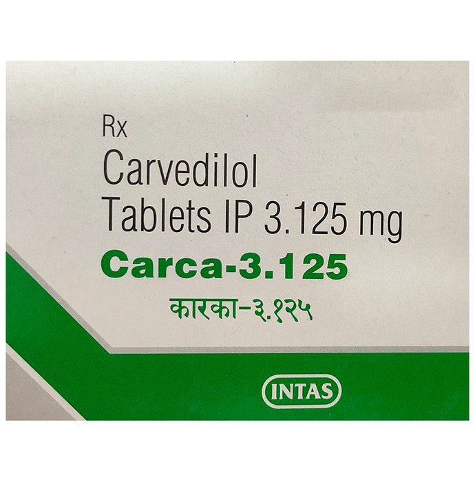 Carca 3.125 Tablet is a medicine used to treat high blood pressure, heart-related chest pain (angina), and heart failure. It works by relaxing the blood vessels, so blood can flow more easily to the heart. Lowering blood pressure also helps prevent future heart attacks and stroke. Carca 3.125 Tablet should be taken with food. You should take it in the dose and duration as advised by the doctor. It is important to take it even if you feel well or if your blood pressure is controlled. Do not stop this medicine without talking to the doctor as your condition could get worse. Making some changes in your lifestyle will help in improving your condition. These may include regular exercise, losing weight, smoking cessation, reducing alcohol intake, and reducing the amount of salt in your diet as advised by your doctor. This medicine is tolerated well by most patients but it may have a few side effects. These include dizziness, headache, and tiredness. Let your doctor know if these side effects bother you or do not go away. Before taking this medicine, let your doctor know if you have any heart or kidney diseases. Pregnant or breastfeeding mothers should also consult their doctor before taking this medicine.
