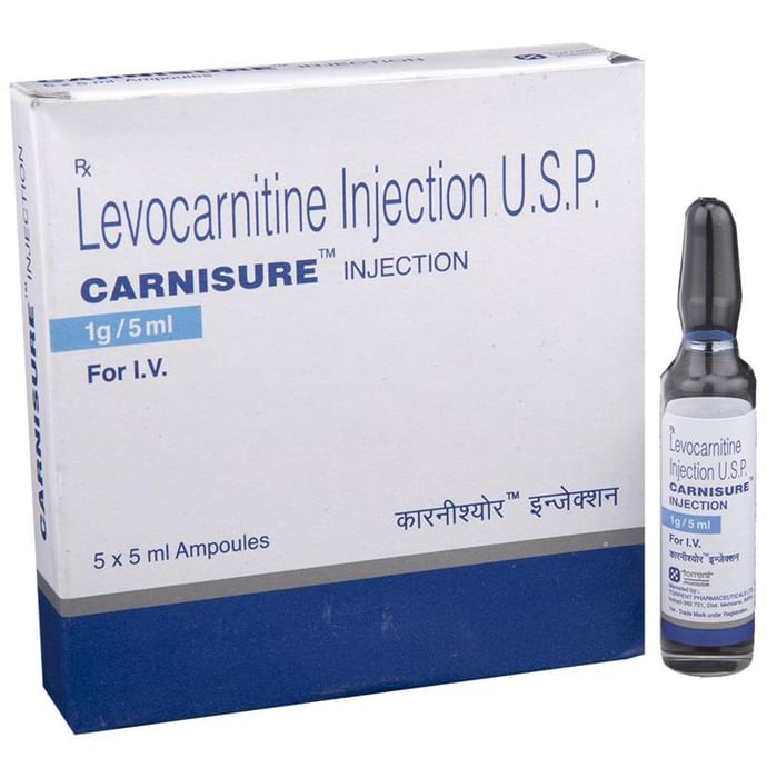 Carnisure Injection belongs to a class of medications called amino acids. It is used in the treatment of carnitine deficiency. It helps the body produce energy and improves the efficiency of body function. Carnisure Injection is generally administered by a healthcare professional. You should not self-administer this at home. It may cause injection site reactions like pain, swelling, redness that are generally mild and temporary. Carnisure Injection is usually a safe medicine, however, it may cause nausea, vomiting, and reactions at the site of injection such as swelling, redness, and pain. Your doctor may monitor your blood glucose levels regularly while you are taking the medicine. Before starting the medicine, inform your doctor if you have any other medical conditions or are taking any other medications. Patients with severe kidney disease should not take this medicine unless prescribed by the doctor.