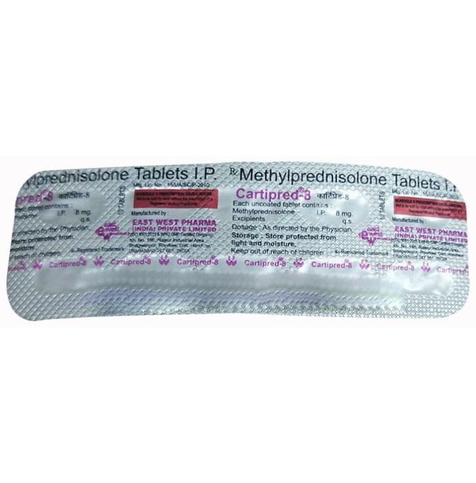 Cartipred 8mg Tablet is a medicine used to treat a wide variety of medical conditions such as severe allergic conditions, asthma, rheumatic disorder, skin and eye disorders, and systemic lupus erythematosus. It provides relief by preventing the release of substances that cause inflammation. Cartipred 8mg Tablet should be taken with food. This will prevent you from getting an upset stomach. The dose and duration will depend on what you are being treated for. You should always take the amount prescribed. Do not take a larger dose or use it more often. Keep taking it regularly even if you feel well. Some conditions will become worse if you stop using this medicine. The most common side effects of this medicine include skin thinning, increased risk of infection, reduction in bone density, weight gain, and mood changes. If these side effects bother you or do not go away, your doctor may suggest ways of preventing or reducing them. The use of this medicine may lower your ability to fight infections so avoid being near people who might pass on infections such as measles, chickenpox, or flu. Before using this medicine, you should tell your doctor if you have brittle bones (osteoporosis), mood disorders, high blood pressure, or liver disease. Also, tell your doctor if you have diabetes, this medicine may increase blood glucose levels which can cause or worsen diabetes. Many other drugs may affect, or be affected by, this medicine so let your doctor know all other medicines you are using, to make sure it is safe. You should also tell your doctor if you are pregnant, planning pregnancy or breastfeeding.