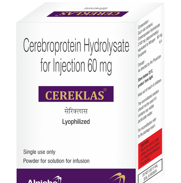 Cereklas 60mg Injection is a prescription medicine used in the treatment of stroke, head injury, and Alzheimer's disease. It may be used alone or in combination with other medicines, depending on the illness it is being used for. Cereklas 60mg Injection is administered as an injection under the supervision of a healthcare professional and should not be self administered. It is given in cases where oral administration is not possible. Take this medicine in the dose and duration as advised by your doctor and if you have missed a dose, take it as soon as you remember. The most common side effects of this medicine include headache, nausea, vertigo, sweating, agitation, fever, hallucinations, confusion, and flu-like syndrome. These are temporary and usually resolve on their own. Please consult your doctor if these do not subside or bother you. Before taking this medicine, inform your doctor if you ever had any problems with your kidneys or if you have or ever had any seizures (epilepsy or fits). Your dose depends on your age and the condition you are being treated for. Always let your doctor know about all the medicines that you are taking before you start with your treatment. Please inform your doctor if you are pregnant, planning to conceive or breastfeeding, before using this medicine.