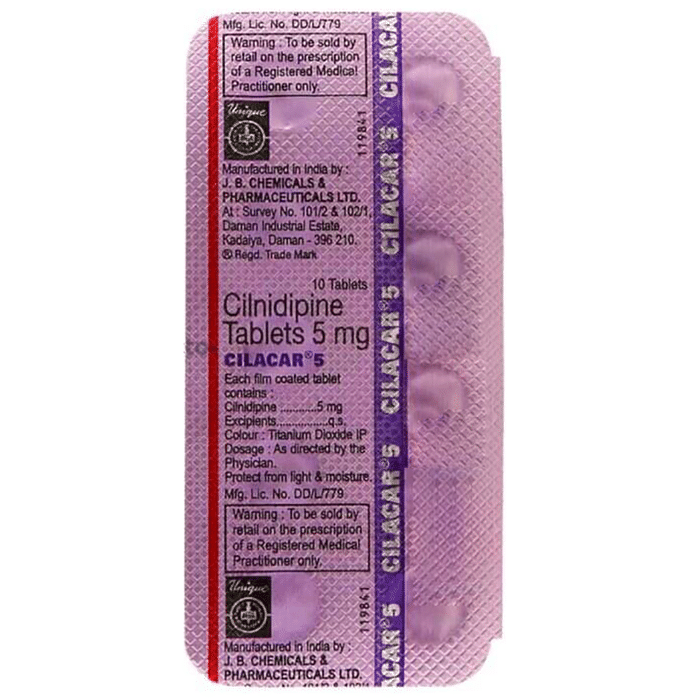 Cilacar 5 Tablet is a medicine used to treat high blood pressure (hypertension). It belongs to a class of medicines known as a calcium channel blocker which helps to lower blood pressure. This helps prevent heart attacks and strokes. It may also be prescribed to prevent angina (heart-related chest pain). Cilacar 5 Tablet may be prescribed alone or along with other medicines. The dose depends on the severity of your condition. You can take it at any time of day, with or without food, but it is best to take it at the same time each day. Keep taking it for as long as advised by your doctor. Do not stop this medicine on your own, even if you feel well because high blood pressure often has no symptoms. This makes it hard to identify any sudden spike and if you stop taking it, your condition may get worse. Keeping active with regular exercise, reducing your weight, and eating a healthy diet will also help control your blood pressure. Follow your doctor’s advice while taking this medicine. The most common side effects include fatigue, edema (swelling in the feet), sleepiness, dizziness, flushing, the unusual beating of the heart (palpitations), and headache. Consult your doctor if any of these bother you, or do not go away. Side effects like swelling in the feet or ankles and palpitations are lesser in severity than other similar medicines of the group. Studies have shown that it also has a protective effect on the kidneys. Before taking it, let your doctor know if you have any liver, kidney, or heart problems. Pregnant or breastfeeding women should also consult their doctor for advice before taking this medicine. You also need to tell your doctor what other medicines you are taking, especially those used to treat high blood pressure or heart conditions. You should have your blood pressure checked regularly to make sure that this medicine is working properly.