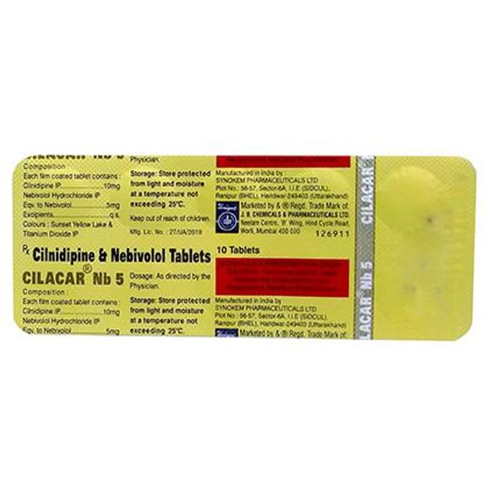 Cilacar NB 5 Tablet is a prescription medicine used to treat hypertension (high blood pressure). It helps to control blood pressure when a single medication is not effective. It helps to lower high blood pressure and thus reduces the chances of future heart attack and stroke. You can take Cilacar NB 5 Tablet at any time of day, with or without food, but it is best to take it at the same time each day. Keep taking it for as long as advised by your doctor. Even if you feel well, do not stop this medicine on your own because high blood pressure often has no symptoms. If you stop taking it, your condition may get worse. Keeping active with regular exercise, reducing your weight and eating a healthy diet will also help control your blood pressure. Follow your doctor’s advice while taking this medicine. It may cause side effects like headache, flushing (sense of warmth in the face, ears, neck and trunk), ankle swelling, slow heart rate, and nausea. It may also cause dizziness, so do not drive or do anything that requires mental focus until you know how this medicine affects you. To reduce the swelling, raise your legs while sitting down. You may be asked for regular monitoring of blood pressure, kidney function, blood sugar level, and electrolytes level while on the treatment. Before taking it, let your doctor know if you have any liver or kidney problems. Pregnant or breastfeeding women should also consult their doctor for advice before taking this medicine. You also need to tell your doctor what other medicines you are taking especially those used to treat high blood pressure or heart conditions.