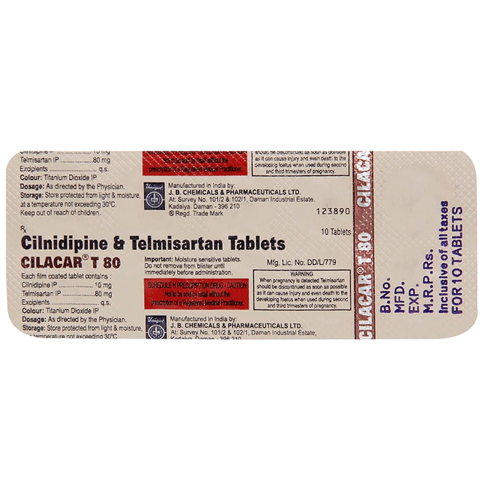 Cilacar T 80 Tablet contains two medicines, both of which help to control high blood pressure. It lowers the blood pressure by relaxing the blood vessels and making it easier for your heart to pump blood around your body. This will reduce your risk of having a heart attack or a stroke. Cilacar T 80 Tablet may be taken on an empty stomach or along with food. However, it is better to take it regularly at a fixed time each day, as prescribed by your doctor. The dose will depend on your condition and how you respond to the medicine. It’s important to keep taking this medicine even if you feel well. By lowering your blood pressure, it is reducing your risk of heart attack or stroke so do not stop taking it unless your doctor tells you to. You can help this medication work better by making a few changes to your lifestyle such as keeping active, stopping smoking, and eating a low salt and low-fat diet. The most common side effects of this medicine include swelling in your ankles or feet (edema), headache, sleepiness, dizziness, tiredness, taste change, and upset stomach. Since it may cause sleepiness and dizziness, do not drive or do anything requiring concentration until you know how it affects you. Talk to your doctor if any of the side effects bother you or will not go away. Before taking this medicine, let your doctor know if you have any kidney or liver problems or severe dehydration. Pregnant or breastfeeding women should also consult their doctor before taking it. While using this medicine, your blood pressure will need to be checked often and your kidney function may also need to be tested.