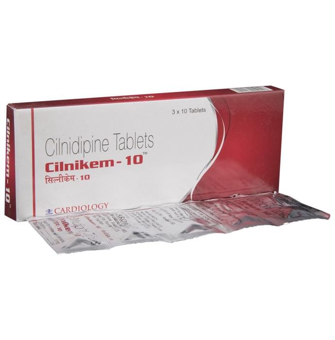 Cilnikem 10 Tablet is a medicine used to treat high blood pressure (hypertension). It belongs to a class of medicines known as a calcium channel blocker which helps to lower blood pressure. This helps prevent heart attacks and strokes. It may also be prescribed to prevent angina (heart-related chest pain). Cilnikem 10 Tablet may be prescribed alone or along with other medicines. The dose depends on the severity of your condition. You can take it at any time of day, with or without food, but it is best to take it at the same time each day. Keep taking it for as long as advised by your doctor. Do not stop this medicine on your own, even if you feel well because high blood pressure often has no symptoms. This makes it hard to identify any sudden spike and if you stop taking it, your condition may get worse. Keeping active with regular exercise, reducing your weight, and eating a healthy diet will also help control your blood pressure. Follow your doctor’s advice while taking this medicine. The most common side effects include fatigue, edema (swelling in the feet), sleepiness, dizziness, flushing, the unusual beating of the heart (palpitations), and headache. Consult your doctor if any of these bother you, or do not go away. Side effects like swelling in the feet or ankles and palpitations are lesser in severity than other similar medicines of the group. Studies have shown that it also has a protective effect on the kidneys. Before taking it, let your doctor know if you have any liver, kidney, or heart problems. Pregnant or breastfeeding women should also consult their doctor for advice before taking this medicine. You also need to tell your doctor what other medicines you are taking, especially those used to treat high blood pressure or heart conditions. You should have your blood pressure checked regularly to make sure that this medicine is working properly.