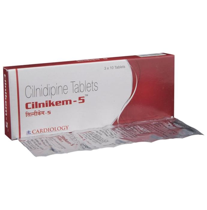 Cilnikem 5 Tablet is a medicine used to treat high blood pressure (hypertension). It belongs to a class of medicines known as a calcium channel blocker which helps to lower blood pressure. This helps prevent heart attacks and strokes. It may also be prescribed to prevent angina (heart-related chest pain). Cilnikem 5 Tablet may be prescribed alone or along with other medicines. The dose depends on the severity of your condition. You can take it at any time of day, with or without food, but it is best to take it at the same time each day. Keep taking it for as long as advised by your doctor. Do not stop this medicine on your own, even if you feel well because high blood pressure often has no symptoms. This makes it hard to identify any sudden spike and if you stop taking it, your condition may get worse. Keeping active with regular exercise, reducing your weight, and eating a healthy diet will also help control your blood pressure. Follow your doctor’s advice while taking this medicine. The most common side effects include fatigue, edema (swelling in the feet), sleepiness, dizziness, flushing, the unusual beating of the heart (palpitations), and headache. Consult your doctor if any of these bother you, or do not go away. Side effects like swelling in the feet or ankles and palpitations are lesser in severity than other similar medicines of the group. Studies have shown that it also has a protective effect on the kidneys. Before taking it, let your doctor know if you have any liver, kidney, or heart problems. Pregnant or breastfeeding women should also consult their doctor for advice before taking this medicine. You also need to tell your doctor what other medicines you are taking, especially those used to treat high blood pressure or heart conditions. You should have your blood pressure checked regularly to make sure that this medicine is working properly.