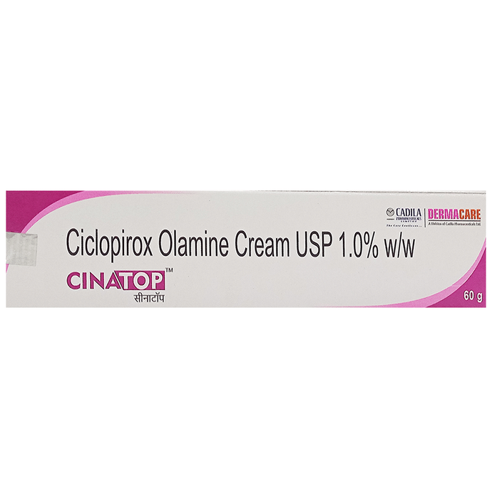 Cinatop Cream is an antifungal medication. It is used in the treatment of fungal skin and nail infections. It works by stopping the growth of fungi, thus treating the infection. Cinatop Cream is for external use only. You should use it in the dose and duration as directed by your doctor. The amount you need, and how long you take it will depend on what you are being treated for. You should normally wash and dry the affected area before applying a thin layer of the medicine. You should avoid getting in contact with your mouth, eyes, and nose. In case of accidental contact, wash it off with plenty of water. Keep using it regularly to get the most benefit. The most common side effects include itching, burning, or stinging sensation at the site of application. They are not usually serious and often disappear with time. If they bother you or do not go away, let your doctor know.