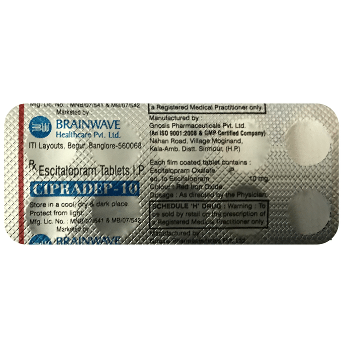 Cipradep 10 Tablet is widely prescribed to treat depression and other mental health conditions like anxiety, panic disorder, and obsessive-compulsive disorder. It is a type of antidepressant known as a selective serotonin reuptake inhibitor (SSRI). Cipradep 10 Tablet helps recover from depression by improving mood and relieving anxiety and tension. It can be taken with or without food. The dose and how often you need it will be decided by your doctor based on the amount needed to control your symptoms. Your doctor may start you on a lower dose and increase it gradually. Do not change the dose or stop taking it without talking to your doctor, even if you feel well. Doing so may make your condition worse or you may suffer from unpleasant withdrawal symptoms (anxiety, restlessness, palpitations, dizziness, sleep disturbances, etc). To get the most benefit, take this medicine regularly at the same time each day. Your doctor may advise you to take it in the morning if you have trouble sleeping. It may take a few weeks before you start feeling better. Let your doctor know if you do not see any improvement even after 4 weeks. Some common side effects of this medicine include nausea, fatigue, increased sweating, insomnia (difficulty in sleeping), decreased sexual drive, delayed ejaculation, and women may experience difficulties achieving orgasm. Some people may experience sleepiness after taking this medicine. Let your doctor know straight away if you develop any sudden worsening of mood or any thoughts about harming yourself. Before taking Cipradep 10 Tablet, you should tell your doctor if you have epilepsy (seizure disorder or fits), diabetes, liver or kidney disease, any heart problems, or are currently taking medicines for depression known as MAO inhibitors. These may affect your treatment. Please tell your doctor about all the medicines you are taking to make sure you are safe.