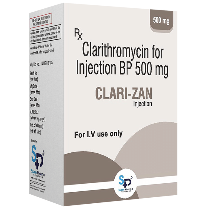 Clari-Zan 500mg Injection is an antibiotic used to treat various types of bacterial infections. It is effective in most infections of the respiratory tract, ear, nose, throat, lungs, and skin. It is also effective against some infections seen in people with reduced immunity. Clari-Zan 500mg Injection stops the bacteria from growing, which helps to resolve your symptoms and cure your infection. This medicine is given by drip or by direct injection into a vein, under the supervision of a healthcare professional. Precise dosage and duration of treatment will be decided by your doctor based on your underlying condition and response to therapy. Do not skip any doses and finish the full course of treatment even if you feel better. Stopping the medicine too early may lead to the infection returning or worsening. Commonly seen side effects with this medicine include rash, sweating, swelling, and altered liver function tests. Some people may also develop pain, swelling or redness at the site of injection occasionally. These are usually temporary and subside with the completion of treatment. Consult your doctor if you find these side effects do not resolve or persist for a longer duration. Inform your doctor if you have any previous history of allergy or heart problems before taking this medicine. Pregnant or breastfeeding women should consult their doctor before using this medicine.