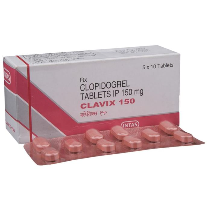 Clavix 150 Tablet is an antiplatelet medicine or a blood thinner that helps to prevent the formation of harmful blood clots in your blood vessels. This helps to lower the chances of you getting a heart attack or stroke. It is a widely used medicine for heart protection. Clavix 150 Tablet is prescribed to people at high risk of heart disease. This includes people with peripheral vascular disease (blood circulation problems due to narrowing of blood vessels), recent heart attack or stroke, irregular heartbeats, and those who have undergone certain heart procedures like stenting. It is also used in combination with some other medicines for the treatment of heart attack and some types of heart-related chest pain (unstable angina). This medicine may be taken with or without food and should be taken at the same time each day. It is important to keep taking this medicine even if you feel well. If you stop taking this medicine, it may increase your chance of having a heart attack or stroke. The most common side effect seen with this medicine is bleeding. This may be in the form of bruising, nose bleeds, blood in urine or stools (black-colored stools), or heavier periods than usual in women. If you cut or injure yourself, it may take longer than usual for the bleeding to stop. Such episodes of bleeding are usually mild and resolve on their own. However, you should consult your doctor straight away if the bleeding persists or worries you. This medicine is not suitable for some people. Do not take it if you are bleeding from anywhere in the body such as a stomach ulcer or bleeding within the brain. Before taking it, you should let your doctor know if you have ever had a problem with your blood not clotting properly or if you have recently had a serious injury or surgery. This medicine may need to be stopped temporarily before planned surgery or dental treatment.