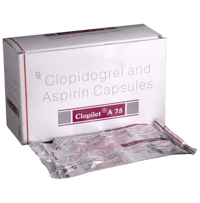 In Prevention of heart attack and stroke Clopilet A 75 Capsule is a combination of two antiplatelet medicines or blood thinners. It prevents blood from clotting inside the veins and arteries. This helps the blood flow freely around your body thereby preventing a heart attack or stroke (or deep vein thrombosis or pulmonary embolism). Both these medicines together prevent the formation of blood clots and also prevent the existing ones from growing bigger in size. Take it regularly and make appropriate lifestyle changes (such as eating healthy and staying active) to maximize the effectiveness of this medicine. Keep taking it even if you feel well.