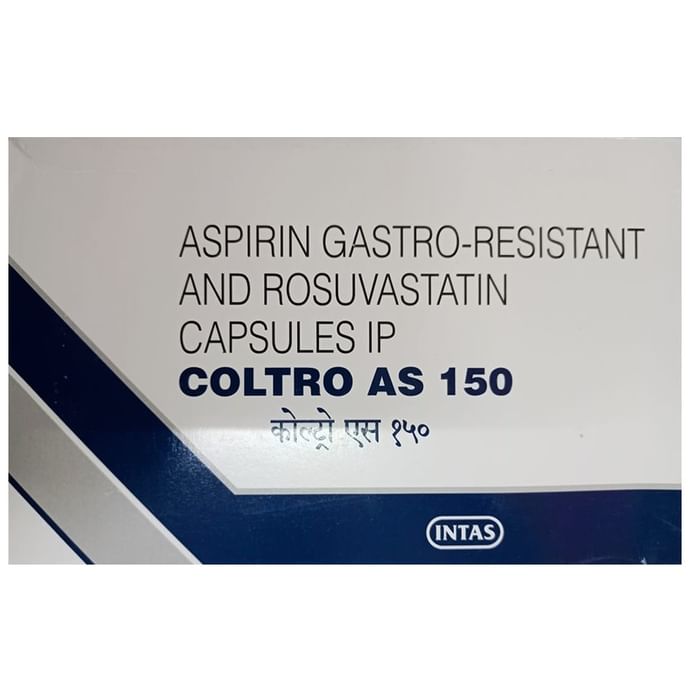 Coltro AS 150 Capsule is a combination of two medicines used to prevent heart attack and stroke. This medicine reduces the "bad" cholesterol (LDL) and triglycerides (fats) levels. Moreover, it also decreases the formation of blood clots. Coltro AS 150 Capsule should be taken with food to avoid stomach upset. You should take it regularly at evenly spaced intervals as per the schedule prescribed by your doctor. Taking it at the same time every day will help you remember to take it. The dose and duration of treatment will depend on what you are being treated for. Do not stop taking it until you have finished the complete course, even when you feel better. Lifestyle changes like low-fat diet, exercise and not smoking may help this medicine to work better. Nausea, abdominal pain, headache, and constipation are some common side effects of this medicine.This medicine increases your risk of bleeding, so it is important to be careful while shaving, cutting nails, using sharp objects, or engaging in contact sports (e.g., football, wrestling). Let your doctor know if you notice yellowing of skin, muscle pain or dark urine. Before taking this medicine, tell your doctor if you have liver or kidney disease or you are suffering from bleeding disorder. You must tell your doctor if you are pregnant, planning pregnancy or breastfeeding. You should also let your healthcare team know all other medicines you are taking as they may affect, or be affected by this medicine.