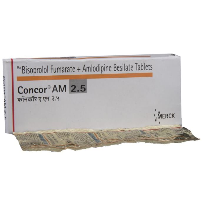 Concor AM 2.5 Tablet is used to treat hypertension (high blood pressure). This is a combination of two medicines that controls blood pressure when a single medication is not effective. It helps to lower high blood pressure and thus reduces the chances of future heart attack and stroke. "Concor AM 2.5 Tablet is a medicine used to treat hypertension (high blood pressure). It is a combination of two medicines that effectively controls blood pressure when a single medication is not effective. It helps to lower high blood pressure and thus reduces the chances of future heart attack and stroke. It should be taken empty stomach preferably in the morning at a fixed time every day. This medicine should not be stopped abruptly as it may result in sudden increase of blood pressure. It should be used along with a proper diet, salt restriction, and regular exercise for best results. Some patients may develop swelling of ankle as a side effect of this medicine. It may also produce dizziness initially, but this improves with time. "