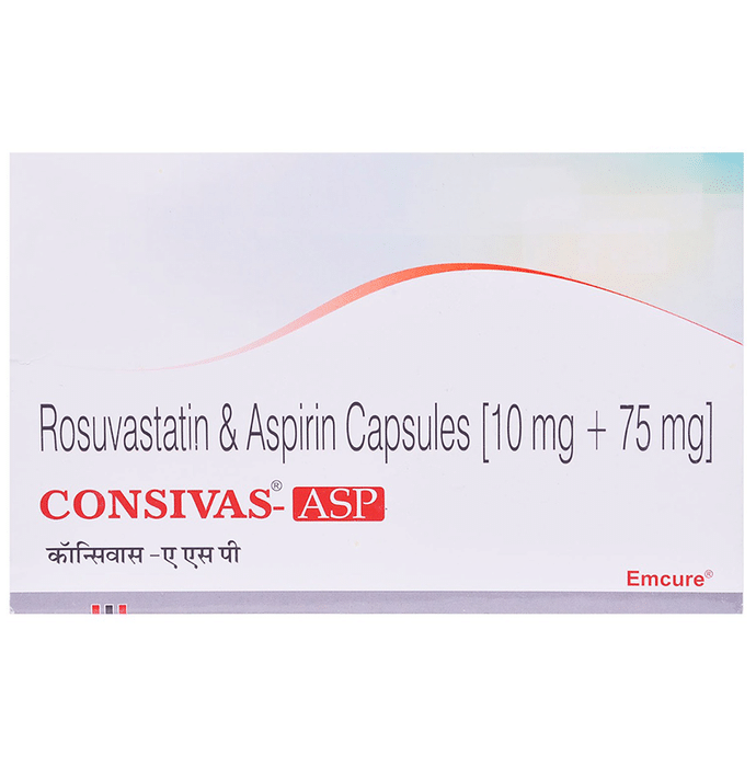 Consivas-Asp Capsule is a combination of two medicines used to prevent heart attack and stroke. This medicine reduces the "bad" cholesterol (LDL) and triglycerides (fats) levels. Moreover, it also decreases the formation of blood clots. Consivas-Asp Capsule should be taken with food to avoid stomach upset. You should take it regularly at evenly spaced intervals as per the schedule prescribed by your doctor. Taking it at the same time every day will help you remember to take it. The dose and duration of treatment will depend on what you are being treated for. Do not stop taking it until you have finished the complete course, even when you feel better. Lifestyle changes like low-fat diet, exercise and not smoking may help this medicine to work better. Nausea, abdominal pain, headache, and constipation are some common side effects of this medicine.This medicine increases your risk of bleeding, so it is important to be careful while shaving, cutting nails, using sharp objects, or engaging in contact sports (e.g., football, wrestling). Let your doctor know if you notice yellowing of skin, muscle pain or dark urine. Before taking this medicine, tell your doctor if you have liver or kidney disease or you are suffering from bleeding disorder. You must tell your doctor if you are pregnant, planning pregnancy or breastfeeding. You should also let your healthcare team know all other medicines you are taking as they may affect, or be affected by this medicine.