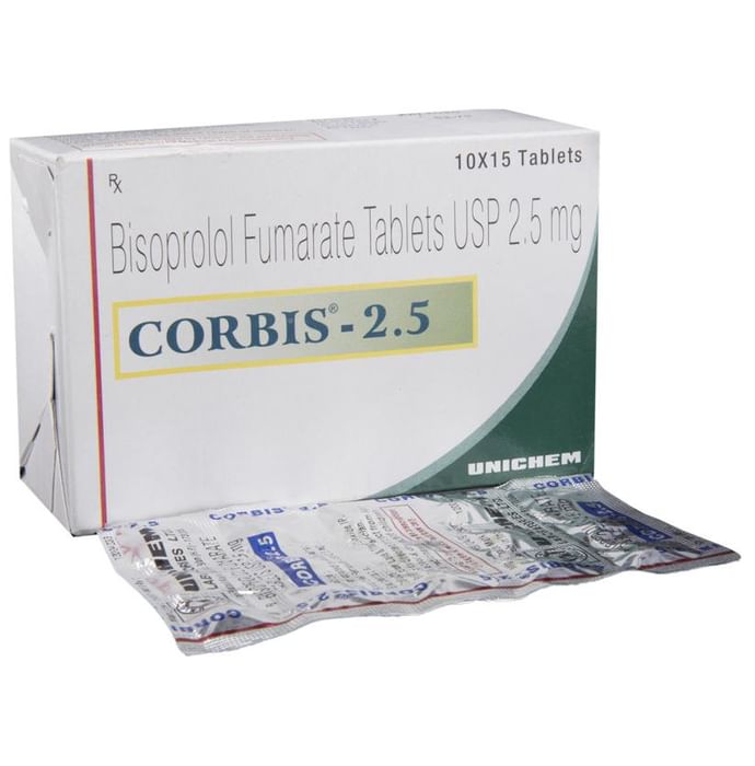 Corbis 2.5 Tablet belongs to a group of medicines called beta-blockers. It is used to treat high blood pressure (hypertension), angina (heart-related chest pain), irregular heart rhythms (arrhythmia). It also helps to prevent future heart attacks and migraines. Corbis 2.5 Tablet is also used to relieve the symptoms caused by an overactive thyroid gland. It may be prescribed alone or together with other medications. The dose and frequency depend on what you are taking it for and the severity of your condition. It may be taken empty stomach or with a meal, but take it regularly at the same time each day to get the most benefit. It may take several weeks before you get the full benefit of this medicine and you may need to take it for the rest of your life. However, it is important to continue taking it even if you feel well. Most people with high blood pressure do not feel ill and if you stop taking it, your condition may worsen. The main side effects of this medicine are fatigue, headache, slow heart rate, dizziness, and nausea. These are usually mild and short-lived. It may also cause shortness of breath or low blood pressure in some people. To reduce the risk of side effects your doctor will probably start the medicine at a low dose and gradually increase it. Consult your doctor if the side effects bother you or do not go away. Before taking it, let your doctor know if you have any liver problems. It may also not be suitable for people who have a slow heart rate, severe circulation problems, severe heart failure, or low blood pressure. Pregnant or breastfeeding mothers should also consult their doctor before taking it. You should have your blood pressure checked regularly to make sure that this medicine is working properly. Avoid drinking alcohol as it may increase certain side effects.
