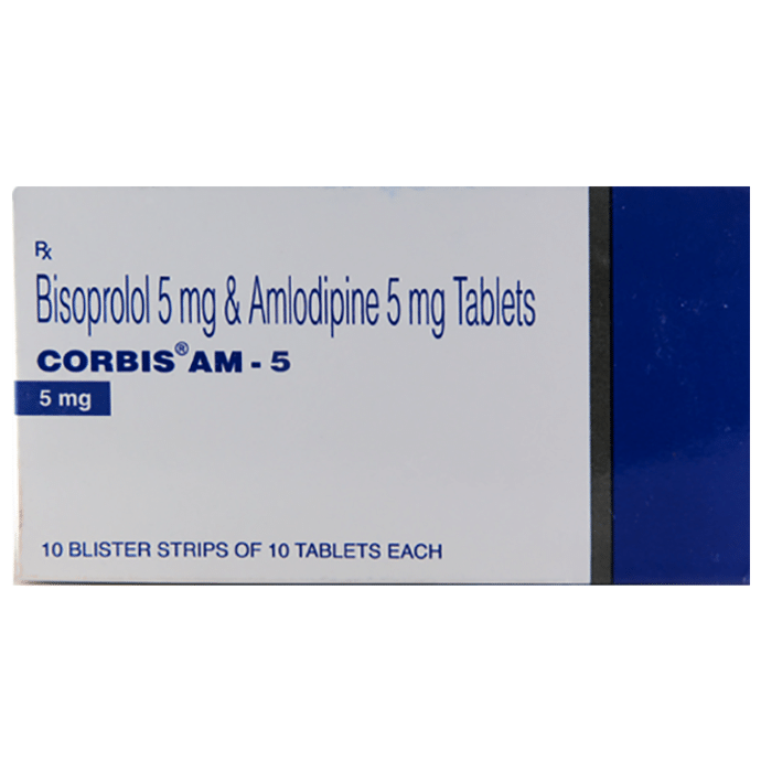 Corbis AM 5 Tablet is used to treat hypertension (high blood pressure). This is a combination of two medicines that controls blood pressure when a single medication is not effective. It helps to lower high blood pressure and thus reduces the chances of future heart attack and stroke. "Corbis AM 5 Tablet is a medicine used to treat hypertension (high blood pressure). It is a combination of two medicines that effectively controls blood pressure when a single medication is not effective. It helps to lower high blood pressure and thus reduces the chances of future heart attack and stroke. It should be taken empty stomach preferably in the morning at a fixed time every day. This medicine should not be stopped abruptly as it may result in sudden increase of blood pressure. It should be used along with a proper diet, salt restriction, and regular exercise for best results. Some patients may develop swelling of ankle as a side effect of this medicine. It may also produce dizziness initially, but this improves with time. "