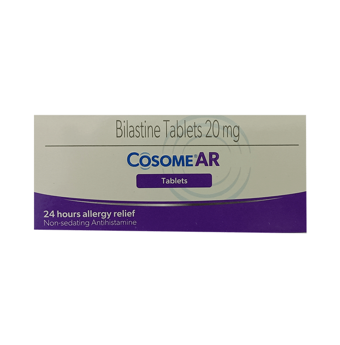 Cosome AR Tablet belongs to a group of medicines known as antihistamines. It is used in the treatment of allergy symptoms such as runny nose, stuffy nose, sneezing, watery eyes, and congestion or stuffiness. Cosome AR Tablet can be taken one hour before or two hours after food, but take it at the same time to get the most benefit. It should be taken as your doctor's advice. The dose and how often you take it depends on what you are taking it for. Your doctor will decide how much you need to improve your symptoms. Remember dosage is decided on the basis of the type of medicine (tablet or syrup ), age and present medical condition of the person. You should take this medicine for as long as it is prescribed for you. If you do not observe any improvement in the symptoms, consult with the doctor. The most common side effects of this medicine include headache and drowsiness. If these bother you or appear serious, let your doctor know. There may be ways of reducing or preventing them. Generally, it is advised to drink plenty of fluids while on treatment with this medicine. To overcome dizziness, avoid driving or attention-seeking activities until you know how the medicine affects you. Before taking this medicine, let your doctor know if you are pregnant, or breastfeeding. Your doctor should also know about all other medicines you are taking as many of these may make this medicine less effective or change the way it works. You must avoid fruit juice before taking the medicine.