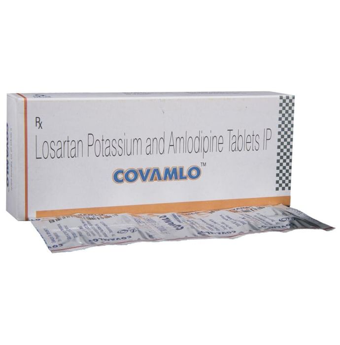 Covamlo Tablet contains two medicines, both of which help to control high blood pressure. It lowers the blood pressure by relaxing the blood vessels and making it easier for your heart to pump blood around your body. This will reduce your risk of having a heart attack or a stroke. Covamlo Tablet may be taken on an empty stomach or along with food. However, it is better to take it regularly at a fixed time each day, as prescribed by your doctor. The dose will depend on your condition and how you respond to the medicine. It’s important to keep taking this medicine even if you feel well. By lowering your blood pressure, it is reducing your risk of heart attack or stroke so do not stop taking it unless your doctor tells you to. You can help this medication work better by making a few changes to your lifestyle such as keeping active, stopping smoking, and eating a low salt and low-fat diet. The most common side effects of this medicine include swelling in your ankles or feet (edema), headache, sleepiness, dizziness, tiredness, taste change, and upset stomach. Since it may cause sleepiness and dizziness, do not drive or do anything requiring concentration until you know how it affects you. Talk to your doctor if any of the side effects bother you or will not go away. Before taking this medicine, let your doctor know if you have any kidney or liver problems or severe dehydration. Pregnant or breastfeeding women should also consult their doctor before taking it. While using this medicine, your blood pressure will need to be checked often and your kidney function may also need to be tested.