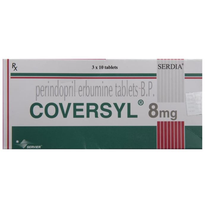 Coversyl 8mg Tablet belongs to a group of medicines known as angiotensin-converting enzyme (ACE) inhibitors. It is widely used to treat high blood pressure and heart failure and may be prescribed after a heart attack. It also lowers the chances of having a heart attack or stroke. Coversyl 8mg Tablet can be prescribed either alone or in combination with other medicines. It should be taken on an empty stomach. This medicine should be taken at the same time each day to get the most benefit. It is important to continue taking it regularly even if you feel well or even if your blood pressure is controlled. Most people with high blood pressure do not feel ill, but if you stop taking this medicine, your condition could get worse. This medicine is considered safe for long-term use. Making some changes in your lifestyle will also help lower your blood pressure. These may include regular exercise, losing weight, smoking cessation, reducing alcohol intake, and reducing the amount of salt in your diet as advised by your doctor. The most common side effects of this medicine include decreased blood pressure, cough, the increased potassium level in blood, fatigue, weakness, and dizziness. Most of these are temporary and resolve with time. Talk to your doctor if any of the side effects bother you or do not go away. Before taking this medicine, let your doctor know if you have any kidney or liver problems. Pregnant or breastfeeding mothers should also consult their doctor before taking it. Your doctor may check your kidney function, blood pressure, and potassium levels in your blood at regular intervals while you are taking this medicine.