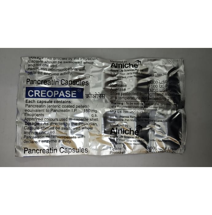 In Pancreatic enzyme deficiency Creopase Capsule is an enzyme supplement for people who do not make enough naturally in their bodies to digest food properly. The enzymes in this medicine help digest food (fats, carbohydrates, and protein) as it passes through the gut. It should be taken with your meal or snack to help it work effectively. Take Creopase Capsule for as long as it is prescribed for maximum benefits. Some may need it for the rest of their lives. You might also be asked to alter your diet to help with digestion.