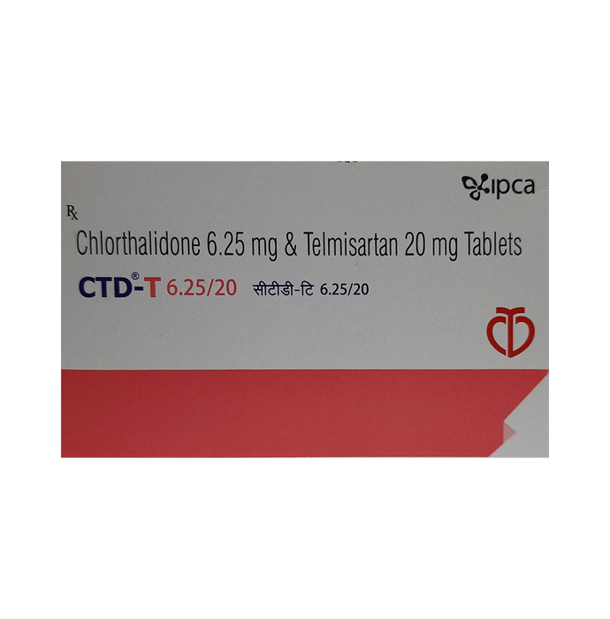 In Hypertension (high blood pressure) CTD-T 6.25/20 Tablet is a combination of two medicines namely Telmisartan and chlorthalidone. It is generally used when one medicine alone is not controlling your blood pressure effectively. Telmisartan works by relaxing and widening your blood vessels so your blood can flow more easily. This will lower your blood pressure. Chlorthalidone is known as a diuretic (water pill) which increases urine output thereby lowering blood pressure. If your blood pressure is controlled you are less at risk of having a heart attack, stroke, or kidney problems. The medicine must be taken regularly as prescribed to be effective. You do not usually feel any direct benefit from taking this medicine, but it works in the long term to keep you well.