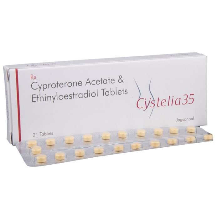 In Treatment of Polycystic ovarian syndrome (PCOS) Women with Polycystic ovarian syndrome (PCOS) have high levels of male hormones called androgens, that are responsible for irregular menstrual cycles (periods), excessive hair growth and acne. Cystelia 35 Tablet is a combination medicine that helps in regulating the production of these androgens as well as periods in females. This also helps in treating excessive hair growth (hirsutism) and acne effectively. Take it as prescribed by the doctor. Do not skip any doses and follow your doctor’s instructions carefully to get maximum benefit.