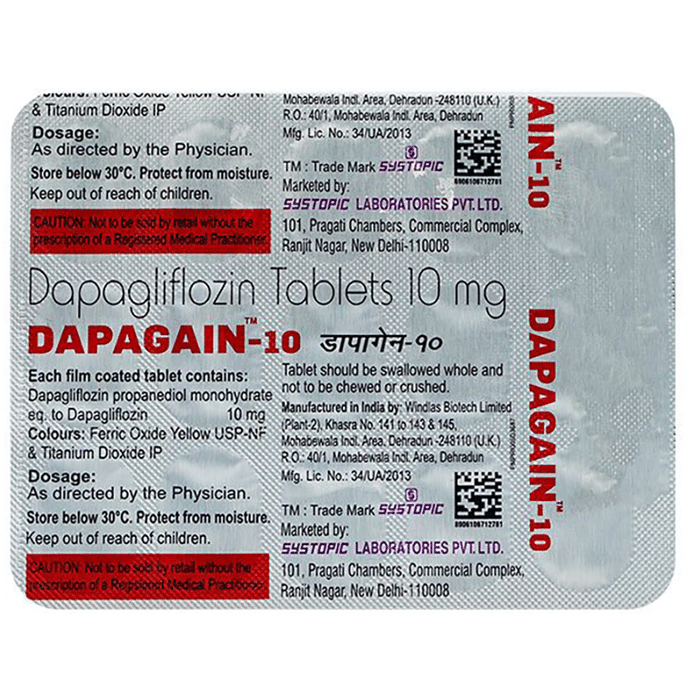 Dapagain 10mg Tablet is used alone or in combination with other medicines to treat type 2 diabetes mellitus. It helps control the high blood sugar levels seen in diabetes. This reduces the chances of serious complications of diabetes and also helps prevent heart disease. Dapagain 10mg Tablet can be taken with or without food at any time of day but you should try to take it at the same time every day. The dose will be decided by your doctor. Do not stop taking it without asking your doctor. If you do, your blood sugar levels may increase and put you at risk of serious complications like kidney damage and blindness. This medicine is only part of a treatment program that should include a healthy diet, regular exercise, and weight reduction as advised by your doctor. The most common side effects of Dapagain 10mg Tablet include fungal infection of the vagina, nasopharyngitis (inflammation of the throat and nasal passages), and urinary tract infections. It may cause the body to lose too much water. Drink plenty of fluids to prevent dehydration. Maintaining good hygiene can help prevent the development of fungal infections in the genital area. Before taking this medicine, inform your doctor if you have any kidney or liver problems or a urinary tract infection or if you are on water pills (diuretics). Pregnant or breastfeeding women should also consult their doctor before taking it. Avoid excessive alcohol intake while taking it as this may increase the risk of developing some side effects. Monitor your blood sugar levels regularly while taking this medicine.