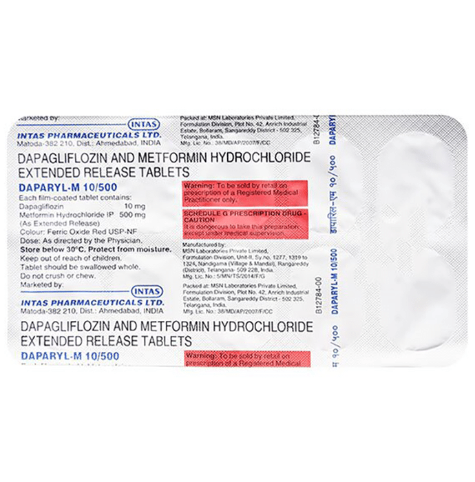 Daparyl M 10/500 Tablet ER is a combination of two medicines used to treat type 2 diabetes mellitus. It helps control the high blood sugar levels seen in diabetes. This reduces the chances of serious complications of diabetes and also helps prevent heart disease. Daparyl M 10/500 Tablet ER can be taken with or without food at any time of day but you should try to take it at the same time every day. The dose will be decided by your doctor. Don’t stop taking it without asking your doctor. If you do, your blood sugar levels may increase and put you at risk of serious complications like kidney damage and blindness. This medicine is only part of a treatment program that should include a healthy diet, regular exercise, and weight reduction as advised by your doctor. The most common side effects of this medicine include sore throat, nasal congestion, runny nose, headache, nausea, vomiting, and diarrhea. Drinking plenty of fluids while using it will help prevent dehydration. Some people may develop fungal infections in the genital area. Maintaining good hygiene can help prevent this. Before taking this medicine, inform your doctor if you have any kidney or liver problems or a urinary tract infection or if you are on water pills (diuretics). Pregnant or breastfeeding women should also consult their doctor before taking it. Avoid excessive alcohol intake while taking it as this may increase the risk of developing some side effects. Monitor your blood sugar levels regularly while taking this medicine.