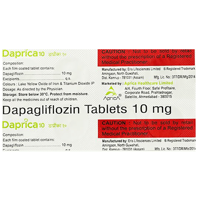 Daprica 10mg Tablet is used alone or in combination with other medicines to treat type 2 diabetes mellitus. It helps control the high blood sugar levels seen in diabetes. This reduces the chances of serious complications of diabetes and also helps prevent heart disease. Daprica 10mg Tablet can be taken with or without food at any time of day but you should try to take it at the same time every day. The dose will be decided by your doctor. Do not stop taking it without asking your doctor. If you do, your blood sugar levels may increase and put you at risk of serious complications like kidney damage and blindness. This medicine is only part of a treatment program that should include a healthy diet, regular exercise, and weight reduction as advised by your doctor. The most common side effects of Daprica 10mg Tablet include fungal infection of the vagina, nasopharyngitis (inflammation of the throat and nasal passages), and urinary tract infections. It may cause the body to lose too much water. Drink plenty of fluids to prevent dehydration. Maintaining good hygiene can help prevent the development of fungal infections in the genital area. Before taking this medicine, inform your doctor if you have any kidney or liver problems or a urinary tract infection or if you are on water pills (diuretics). Pregnant or breastfeeding women should also consult their doctor before taking it. Avoid excessive alcohol intake while taking it as this may increase the risk of developing some side effects. Monitor your blood sugar levels regularly while taking this medicine.